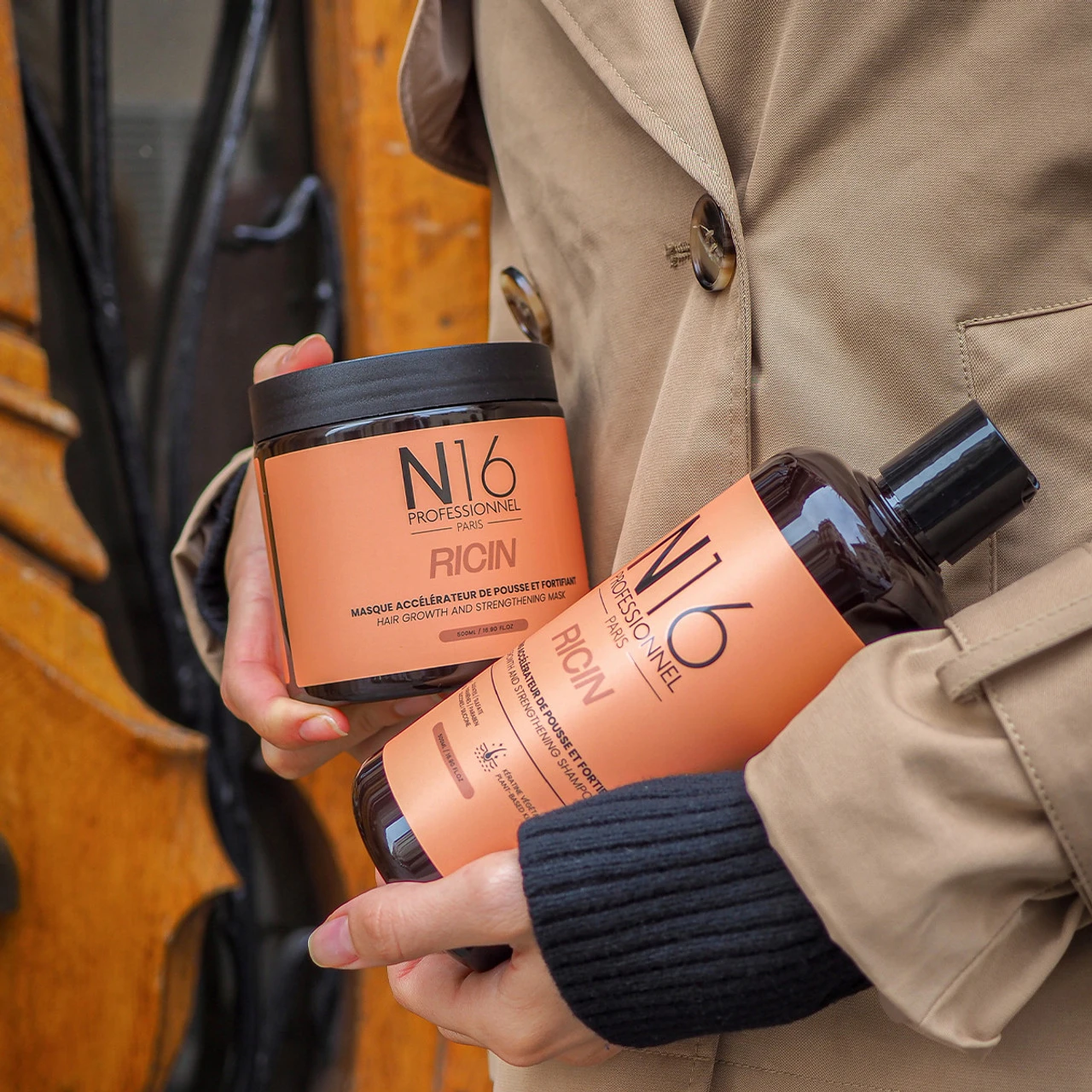 – Répéter si nécessaire. Poursuivre avec votre Masque Ricin Accélérateur de Pousse N16 Professionnel.N16 Professionnel – Shampooing Ricin Accélérateur de Pousse 500 ml